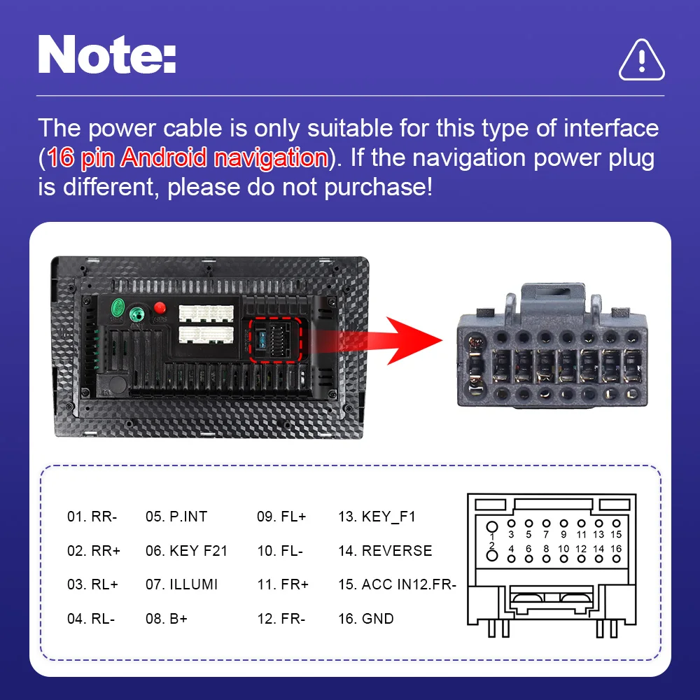 The power cable is only suitable for this type of interface (16 pin Android navigation). If the navigation power plug is different, please do not purchase!
