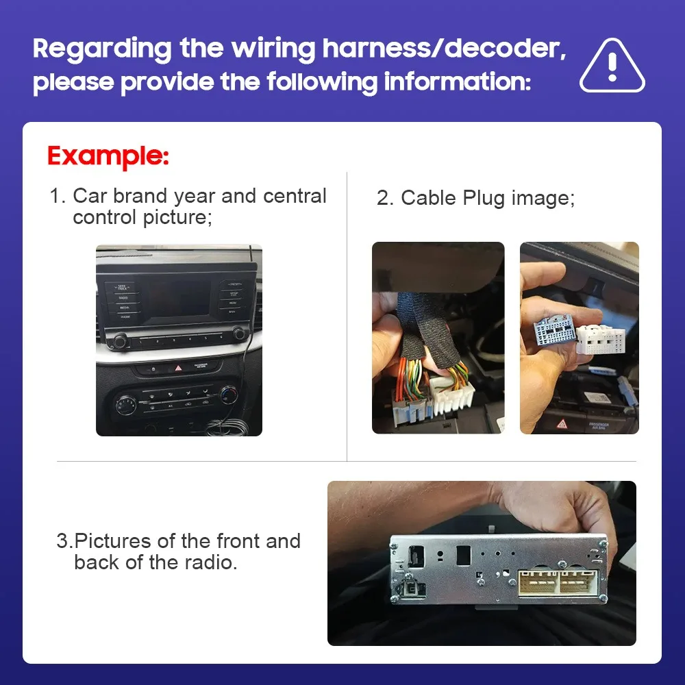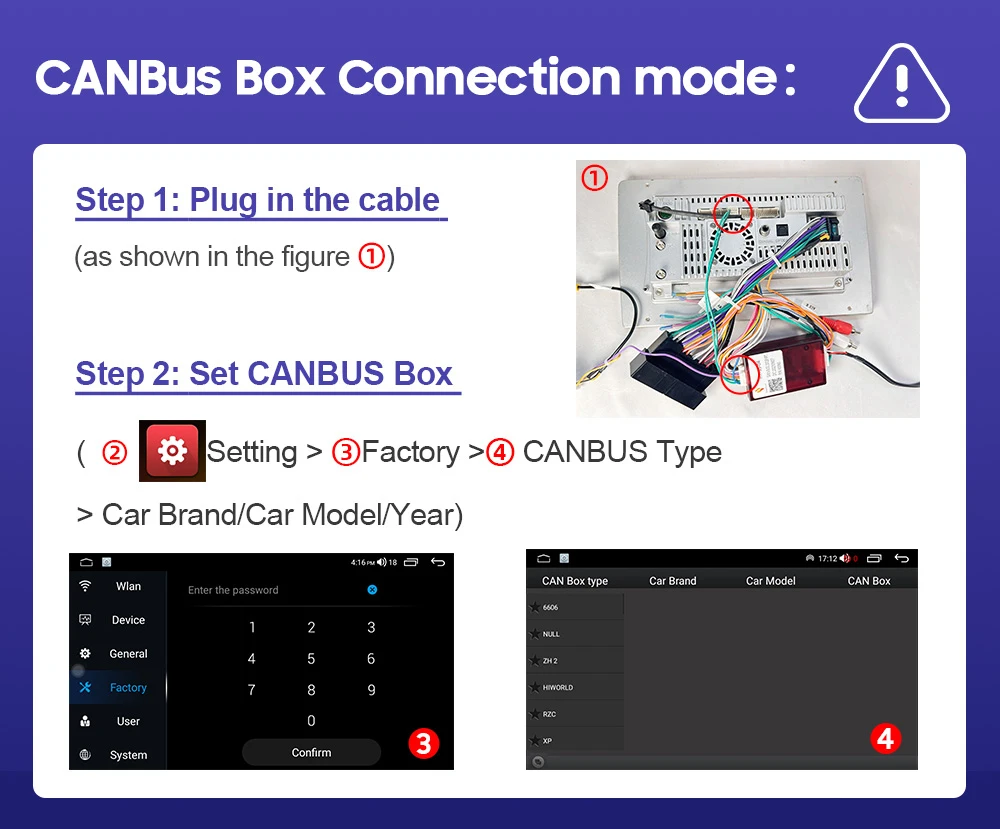 Select the correct CANBUS brand (If you don’t know the CANBUS brand, contact customer service)-Car Brand-Select the Car Model-Select specific Configuration or year-Save and Reboot. (Because the Android navigation solutions on the market are different, you may not find the corresponding model, please contact us for technical support)”